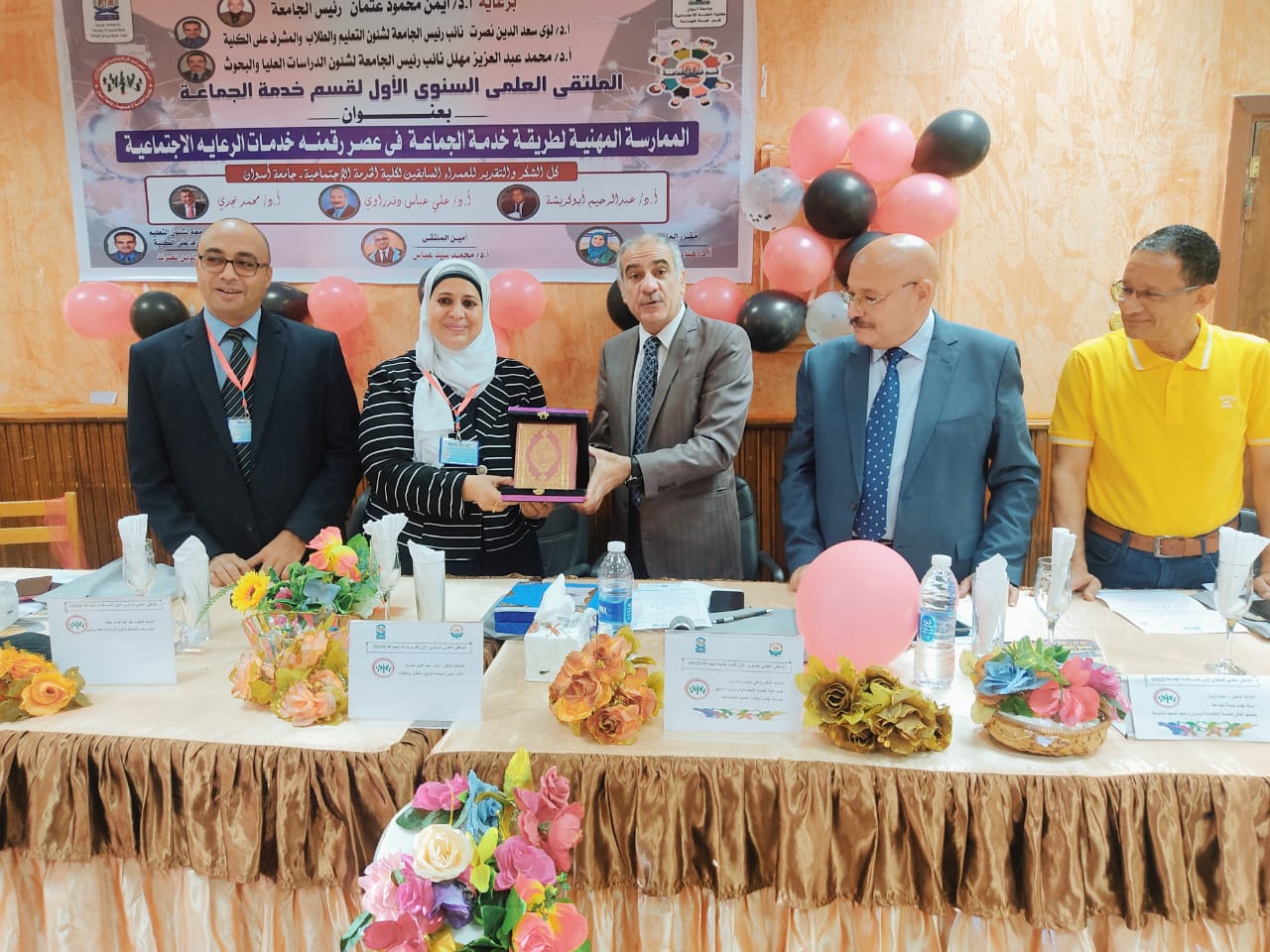 وبحضور الدكتور لؤي سعد الدين نصرت نائب رئيس الجامعة لشئون التعليم والطلاب والمشرف على الكلية، والدكتور محمد عبدالعزيز عرابي نائب رئيس الجامعة لشئون الدراسات العليا والبحوث، والدكتورعلي عباس دندراوي أستاذ مجالات الخدمة الاجتماعية ونائب رئيس الجامعة الأسبق لشئون خدمة المجتمع وتنمية البيئة، والدكتور عماد ثروت شرقاوي عميد المعهد المتوسط للخدمة الاجتماعية بأسوان، والدكتورة هناء عارف أحمد أستاذ خدمة الجماعة ورئيس قسم خدمة الجماعة ومقرر الملتقى، والدكتور محمد سيد عباس أستاذ خدمة الجماعة ووكيل الكلية لشئون التعليم والطلاب وأمين الملتقى، والدكتور حمدي السيد عاصي الأستاذ المساعد بقسم خدمة الجماعة، والدكتور أيمن أحمد عصام المدرس بقسم خدمة الجماعة، ونخبة من أعضاء هيئة التدريس بالكلية.
