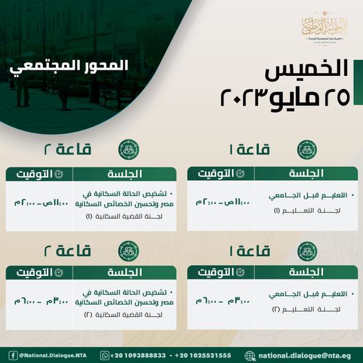 يشهد غدا الخميس، عقد ثاني الجلسات النقاشية للمحور المجتمعي بالحوار الوطني، حيث تعقد أربع جلسات، تخصص جلستان منهما للجنة التعليم وذلك لمناقشة "التعليم قبل الجامعي"، وعلى التوازي منهما تخصص الجلستان الأخريان للجنة القضية السكانية لمناقشة "تشخيص الحالة السكانية في مصر وتحسين الخصائص السكانية".