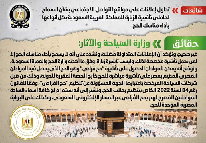 تداولت بعض المواقع الإلكترونية وصفحات التواصل الاجتماعي إعلانات بشأن السماح لحاملي تأشيرة الزيارة للمملكة العربية السعودية بكل أنواعها بأداء مناسك الحج، وقد قام المركز الإعلامي لمجلس الوزراء بالتواصل مع وزارة السياحة والآثار، والتي نفت تلك الأنباء، مُؤكدةً أنه لا صحة للسماح لحاملي تأشيرة الزيارة للمملكة العربية السعودية بكل أنواعها بأداء مناسك الحج، وأن الإعلانات المتداولة مُضللة، مُشددةً على أنه لا يُسمح بأداء مناسك الحج إلا لمن يحمل تأشيرة مخصصة لذلك، وليست تأشيرة زيارة، وفق ما أكدته وزارة الحج والعمرة السعودية، مُوضحةً أنه يمكن للمواطن الحصول على تأشيرة "حج فرادى" وهو الحج الذي يحصل فيه المواطن المصري المقيم بمصر على تأشيرة مباشرة للحج خارج الحصة المقررة للدولة، وذلك من قبل شركات السياحة المرخصة باعتبارها الجهة المسؤولة عن تنظيم "حج الفرادى"، وفقاً للقانون رقم 84 لسنة 2022 الخاص بتنظيم رحلات الحج، مُشيرةً إلى أنه سيتم إدراج كافة أسماء السادة المواطنين المُصرح لهم بحج الفُرادى عبر المسار الإلكتروني السعودي، وكذلك على البوابة المصرية الموحدة للحج.