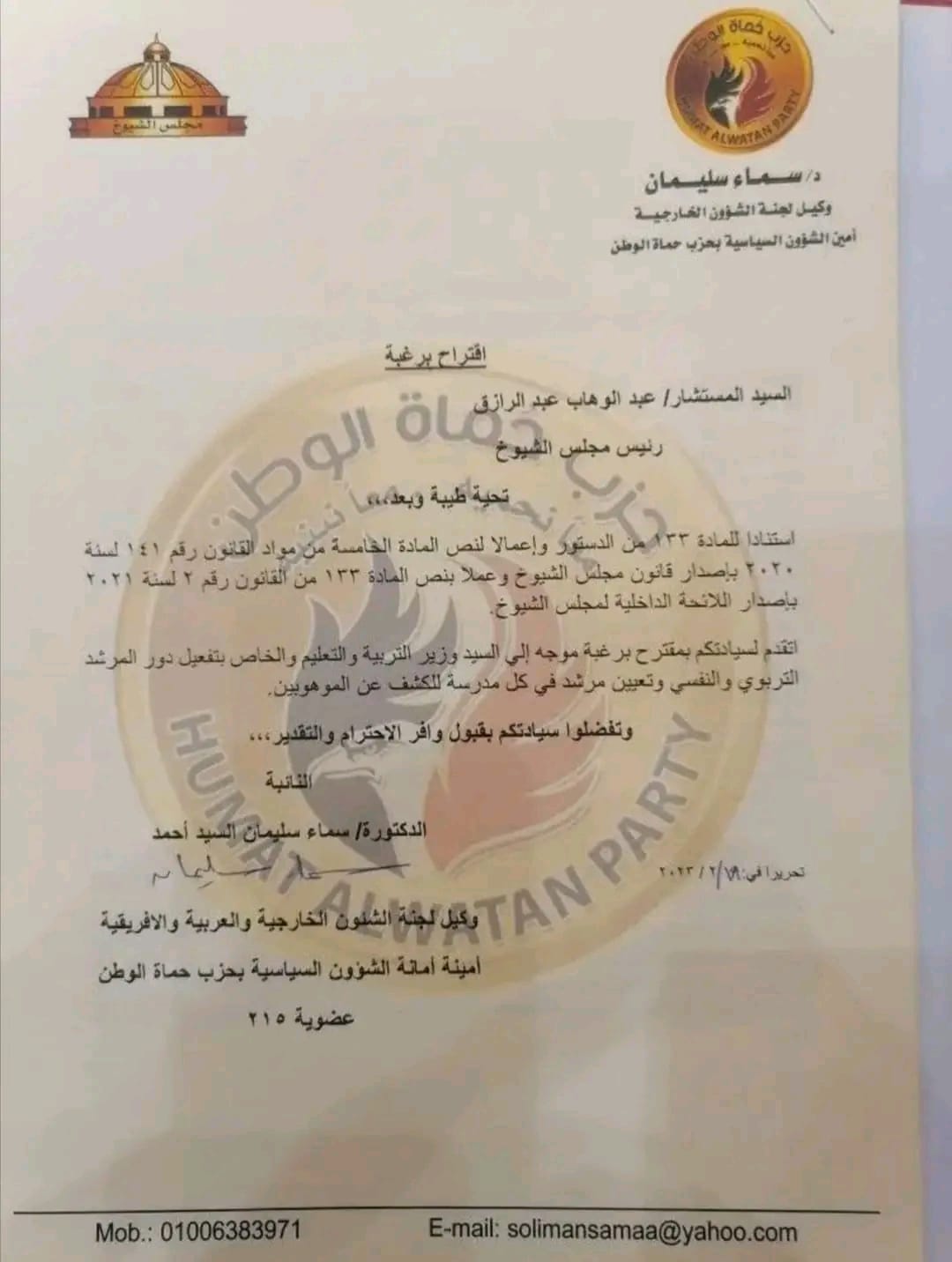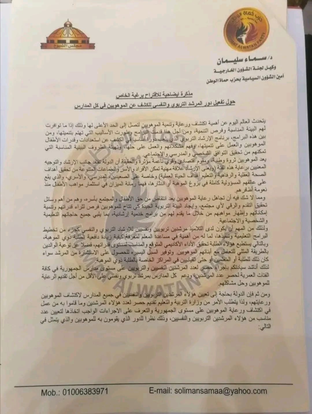 وكانت قد تقدمت النائبة سماء سليمان، عضو مجلس الشيوخ، باقتراح برغبة للمستشار عبدالوهاب عبدالرازق، رئيس مجلس الشيوخ، موجه لوزير التربية والتعليم، بشأن تفيعل دور المرشد التربوي والنفسي وتعيين مرشد في كل مدرسة للكشف عن الموهوبين.