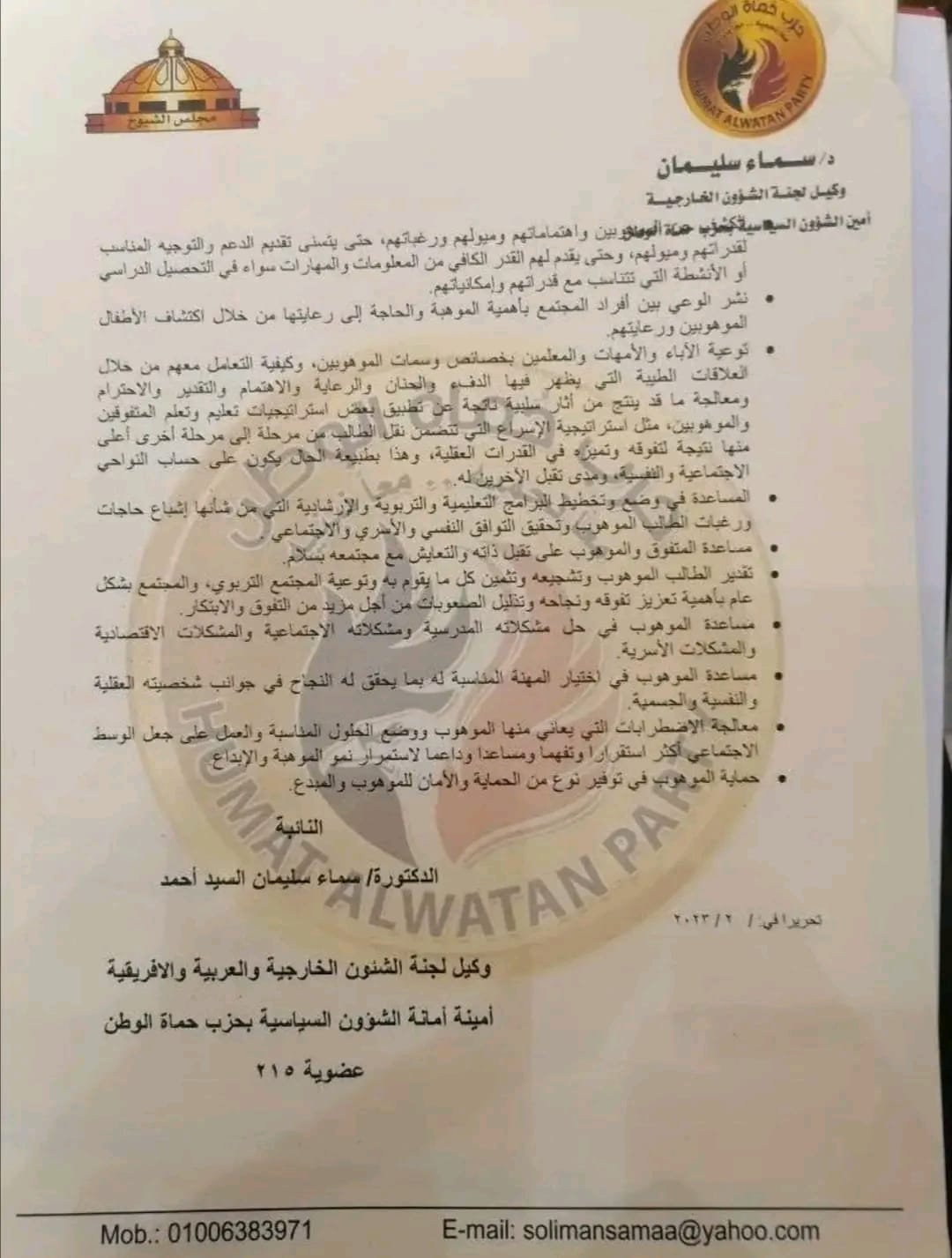توجهت الدكتورة سماء سليمان وكيل لجنة الشؤون الخارجية والعربية والأفريقية بمجلس الشيوخ وامينة الشؤون السياسية بحزب حماة الوطن بالشكر للرئيس عبد الفتاح السيسي علي سرعة الاستجابة للاقتراح برغبة المقدم منها بمجلس الشيوخ للاهتمام بالموهوبين والمرشدين التربويين والنفسيين الذين يرعوا الموهوبين وتم مناقشته بلجنة التعليم والبحث العلمي والاتصالات وتكنولوجيا المعلومات بالمجلس يوم الاخد الموافق ٧ مايو ٢٠٢٣.