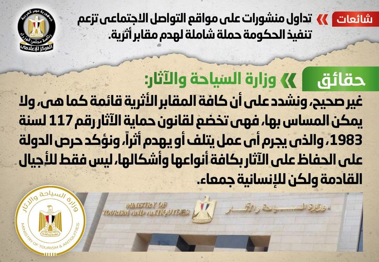 وقام المركز الإعلامي لمجلس الوزراء بالتواصل مع وزارة السياحة والآثار، والتي نفت تلك الأنباء، مُؤكدةً أنه لا صحة لتنفيذ الحكومة حملة شاملة لهدم مقابر أثرية، مُشددةً على أن كافة المقابر الأثرية قائمة كما هي، ولا يمكن المساس بها، فهي تخضع لقانون حماية الآثار رقم ١١٧ لسنة ١٩٨٣، والذي يجرم أي عمل يتلف أو يهدم أثراً.