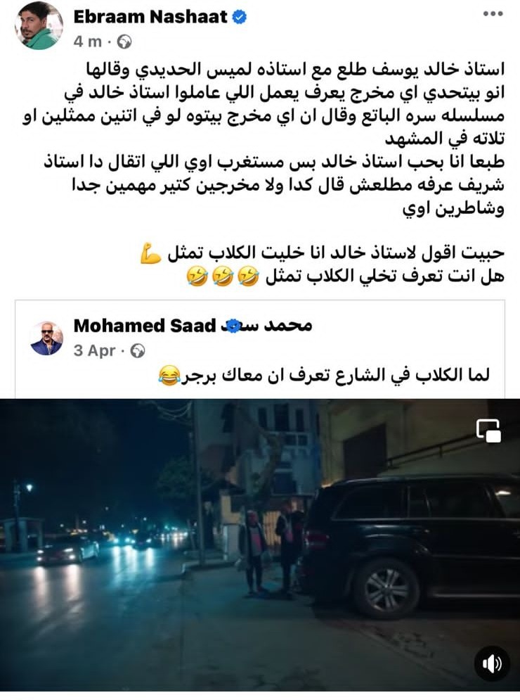 وكتب إبرام نشأت، ردًا على تصريحات المخرج خالد يوسف ، قائلا:" استاذ خالد يوسف طلع مع استاذه لميس الحديدي وقالها انو بيتحدي اي مخرج يعرف يعمل اللي عاملوا استاذ خالد في مسلسله سره الباتع وقال ان اي مخرج بيتوه لو في اتنين ممثلين او تلاته في المشهد".