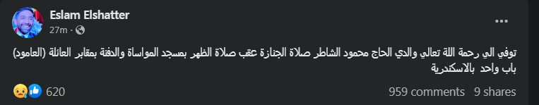 وكتب إسلام الشاطر نجم الأهلي السابق عبر حسابه الرسمي"فيسوك:" توفي الي رحمة اللة تعالي والدي الحاج محمود الشاطر صلاة الجنازة عقب صلاة الظهر بمسجد المواساة والدفنة بمقابر العائلة (العامود) باب واحد بالاسكندرية.