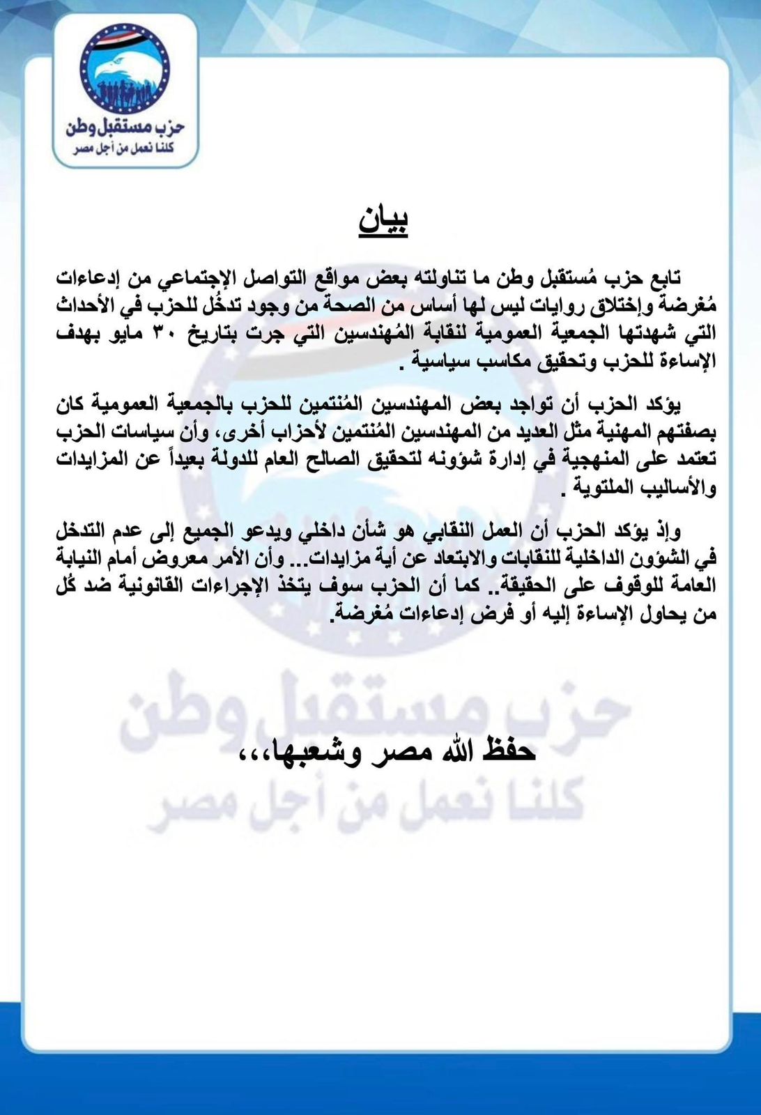 أكد حزب مستقبل وطن متابعته لما تناولته بعض مواقع التواصل الإجتماعي من إدعاءات مغرضة وإختلاق روايات ليس لها أساس من الصحة من وجود تدخل للحزب في الأحداث التي شهدتها الجمعية العمومية لنقابة المهندسين التي جرت بتاريخ ۳۰ مايو بهدف الإساءة للحزب وتحقيق مكاسب سياسية .