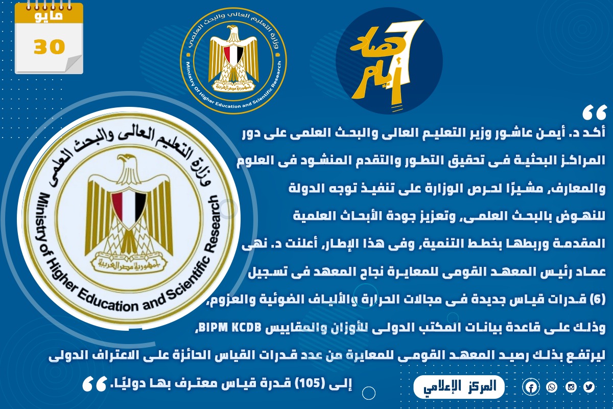 5) أكد الدكتور أيمن عاشور وزير التعليم العالي والبحث العلمي، دور المراكز البحثية في تحقيق التطور والتقدم المنشود في العلوم والمعارف، مشيرًا لحرص الوزارة على تنفيذ توجه الدولة للنهوض بالبحث العلمي، وتعزيز جودة الأبحاث العلمية المقدمة وربطها بخطط التنمية، وفي هذا الإطار، أعلنت الدكتورة نهى عماد رئيس المعهد القومي للمعايرة نجاح المعهد في تسجيل (6) قدرات قياس جديدة في مجالات الحرارة والألياف الضوئية والعزوم، وذلك على قاعدة بيانات المكتب الدولي للأوزان والمقاييس BIPM KCDB، ليرتفع بذلك رصيد المعهد القومي للمعايرة من عدد قدرات القياس الحائزة على الاعتراف الدولي إلى (105) قدرة قياس معترف بها دوليًا.