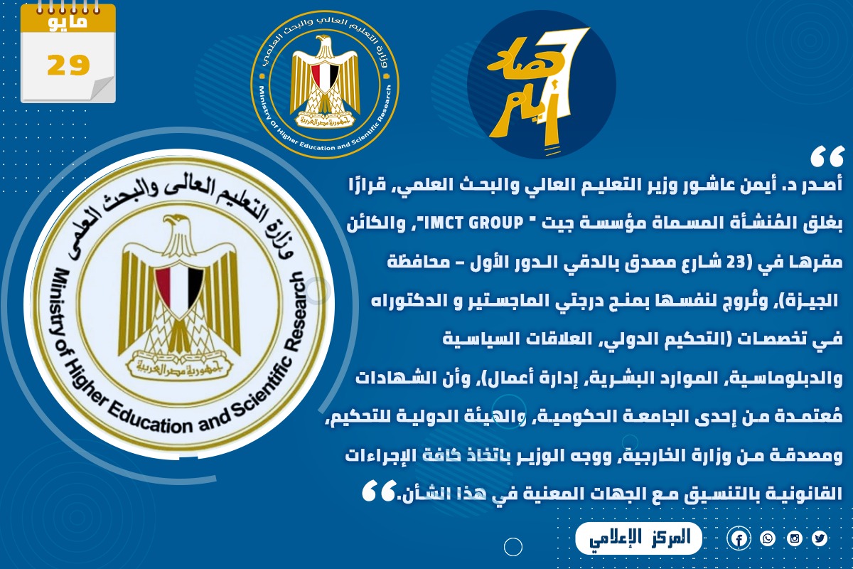 4) أصدر الدكتور أيمن عاشور وزير التعليم العالي والبحث العلمي، قرارًا بغلق المُنشأة المسماة مؤسسة جيت " IMCT GROUP"، والكائن مقرها في (23 شارع مصدق بالدقي الدور الأول – محافظة الجيزة)، وتُروج لنفسها بمنح درجتي الماجستير و الدكتوراه في تخصصات (التحكيم الدولي، العلاقات السياسية والدبلوماسية، الموارد البشرية، إدارة أعمال)، وأن الشهادات مُعتمدة من إحدى الجامعة الحكومية، والهيئة الدولية للتحكيم، ومصدقة من وزارة الخارجية، ووجه الوزير باتخاذ كافة الإجراءات القانونية بالتنسيق مع الجهات المعنية في هذا الشأن.