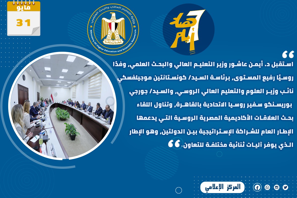 3) استقبل الدكتور أيمن عاشور وزير التعليم العالي والبحث العلمي، وفدًا روسيًا رفيع المستوى، برئاسة كونستانتين موجيلفسكي نائب وزير العلوم والتعليم العالي الروسي، وجورجي بوريسنكو سفير روسيا الاتحادية بالقاهرة، وتناول اللقاء بحث العلاقات الأكاديمية المصرية الروسية التي يدعمها الإطار العام للشراكة الإستراتيجية بين الدولتين، وهو الإطار الذي يوفر آليات ثنائية مختلفة للتعاون.