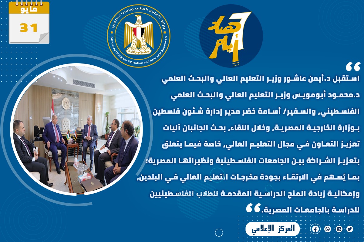 2) استقبل الدكتور أيمن عاشور وزير التعليم العالي والبحث العلمي الدكتور محمود أبومويس وزير التعليم العالي والبحث العلمي الفلسطيني، والسفير أسامة خضر مدير إدارة شئون فلسطين بوزارة الخارجية المصرية، وخلال اللقاء، بحث الجانبان آليات تعزيز التعاون في مجال التعليم العالي، خاصة فيما يتعلق بتعزيز الشراكة بين الجامعات الفلسطينية ونظيراتها المصرية؛ بما يُسهم في الارتقاء بجودة مخرجات التعليم العالي في البلدين، وإمكانية زيادة المنح الدراسية المقدمة للطلاب الفلسطينيين للدراسة بالجامعات المصرية.