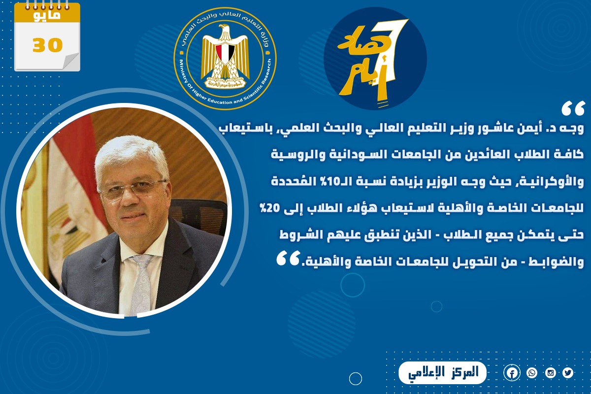 1) وجه الدكتور أيمن عاشور وزير التعليم العالي والبحث العلمي، باستيعاب كافة الطلاب العائدين من الجامعات السودانية والروسية والأوكرانية، حيث وجه الوزير بزيادة نسبة الـ10% المُحددة للجامعات الخاصة والأهلية لاستيعاب هؤلاء الطلاب إلى 20% حتى يتمكن جميع الطلاب - الذين تنطبق عليهم الشروط والضوابط - من التحويل للجامعات الخاصة والأهلية.