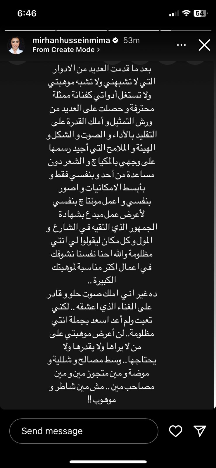 وأوضحت ميرهان حسين: دا غير إني أملك صوت حلو قادر على الغناء الذي أعشقه لكني تعبت ولم أعد أسعد بكلمة إنتي مظلومة، لن أعرض موهبتي على من لا يراها ولا يقدرها ولا يحتاجها وسط مصالح وشللية وموضة ومين متجوز مين.