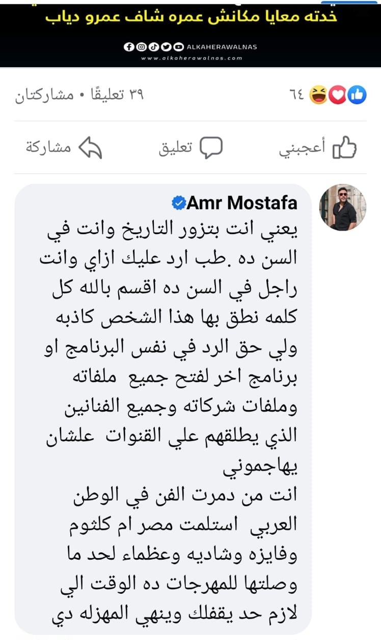 ورد عمرو مصطفى على هذا التصريح، فقال: يعني أنت بتزور التاريخ وأنت في السن ده.. طب أرد عليك إزاي وأنت راجل في السن ده، أقسم بالله كل كلمة نطق بها هذا الشخص كاذبة.. ولي حق الرد في نفس البرنامج أو برنامج آخر لفتح جميع ملفاته وملفات شركاته وجميع الفنانين الذي يطلقهم على القنوات علشان يهاجموني أنت مَن دمرت الفن في الوطن العربي، استلمت مصر أم كلثوم وفايزة وشادية وعظماء لحد ما وصلتها للمهرجانات.. ده الوقت اللي لازم حد يقف لك وينهي المهزلة دي.