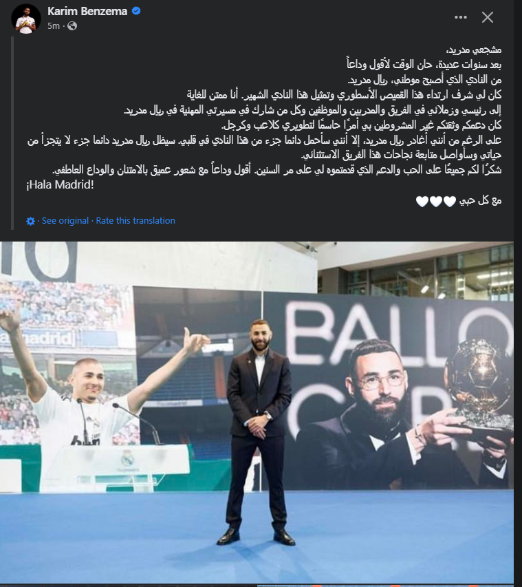 وكتب كريم بنزيما عبر حسابة الرسمي"فيسبوك":"مشجعي مدريد، بعد سنوات عديدة، حان الوقت لأقول وداعاً من النادي الذي أصبح موطني، ريال مدريد، كان لي شرف ارتداء هذا القميص الأسطوري وتمثيل هذا النادي الشهير.