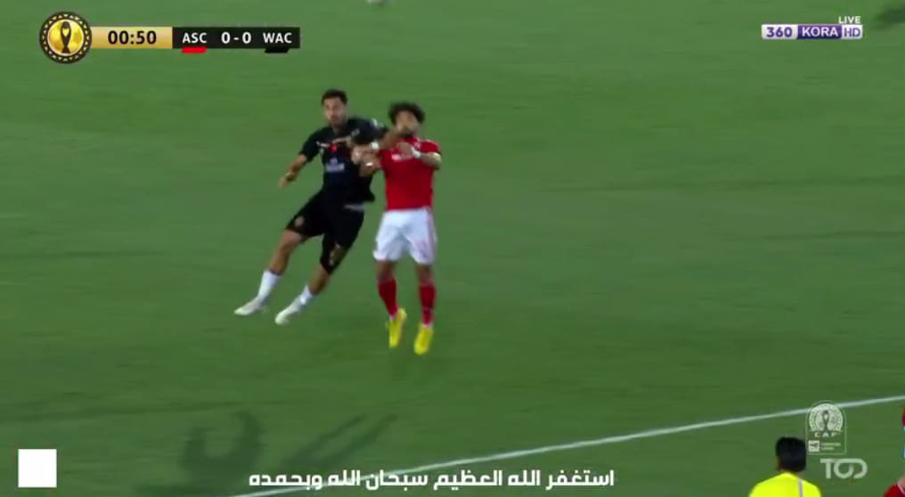 1- شهدت الدقيقة الأولى من عمر مباراة الأهلي والوداد المغربي، تدخل عنيف من لاعب الوداد على مروان عطية لاعب خط وسط النادي الأهلي، بالكوع حيث تستوجب الكرة إنذار، واكتفى حكم المباراة باحتساب ركلة حرة بدون إنذار.