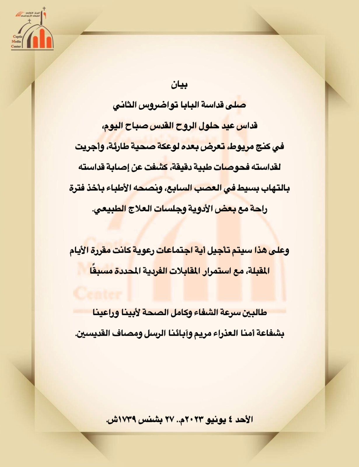 وأعلن أنه سيتم تأجيل أية اجتماعات رعوية كانت مقررة الأيام المقبلة، مع استمرار المقابلات الفردية المحددة مسبقًا، طالبين سرعة الشفاء وكامل الصحة لأبينا وراعينا بشفاعة أمنا العذراء مريم وآبائنا الرسل ومصاف القديسين.