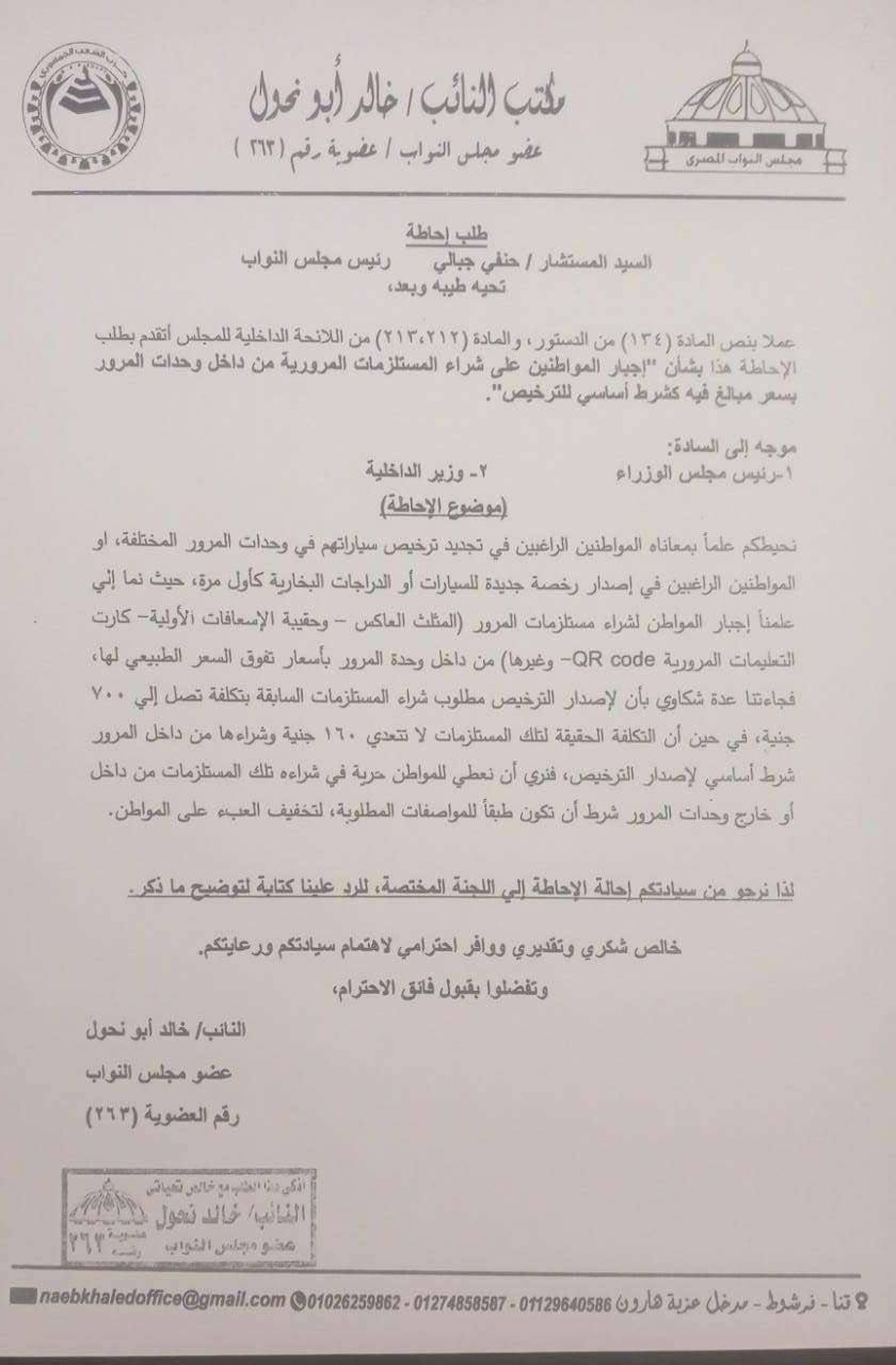 تقدم النائب خالد أبو نحول، عضو مجلس النواب، بطلب إحاطة للمستشار الدكتور حنفي جبالي، وتوجيهه إلى رئيس مجلس الوزراء، ووزير الداخلية بشأن "إجبار المواطنين على شراء المستلزمات المرورية من داخل وحدات المرور بسعر مبالغ فيه كشرط أساسي للترخيص".