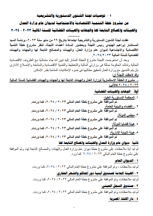 لجان مجلس النواب أعلنت عن توصياتها بشأن مشروع خطة التنمية الاقتصادية والاجتماعية، حيث أوضحت لجنة الشئون الدستورية والتشريعية توصياتها عن خطة التنمية الاقتصادية والاجتماعية لديوان عام وزارة العدل والهيئات والمصالح التابعة لها والجهات والهيئات القضائية للسنة المالية 2023-2024، والتي جاءت كالتالي: