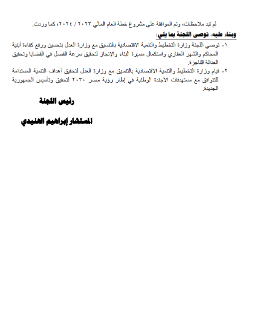 -توصي اللجنة وزارة التخطيط والتنمية الاقتصادية بالتنسيق مع وزارة العدل بتحسين ورفع كفاءة أبنية المحاكم والشهر العقاري واستكمال مسيرة البناء والانجاز لتحقيق سرعة الفصل في القضايا وتحقيق العدالة الناجزة.