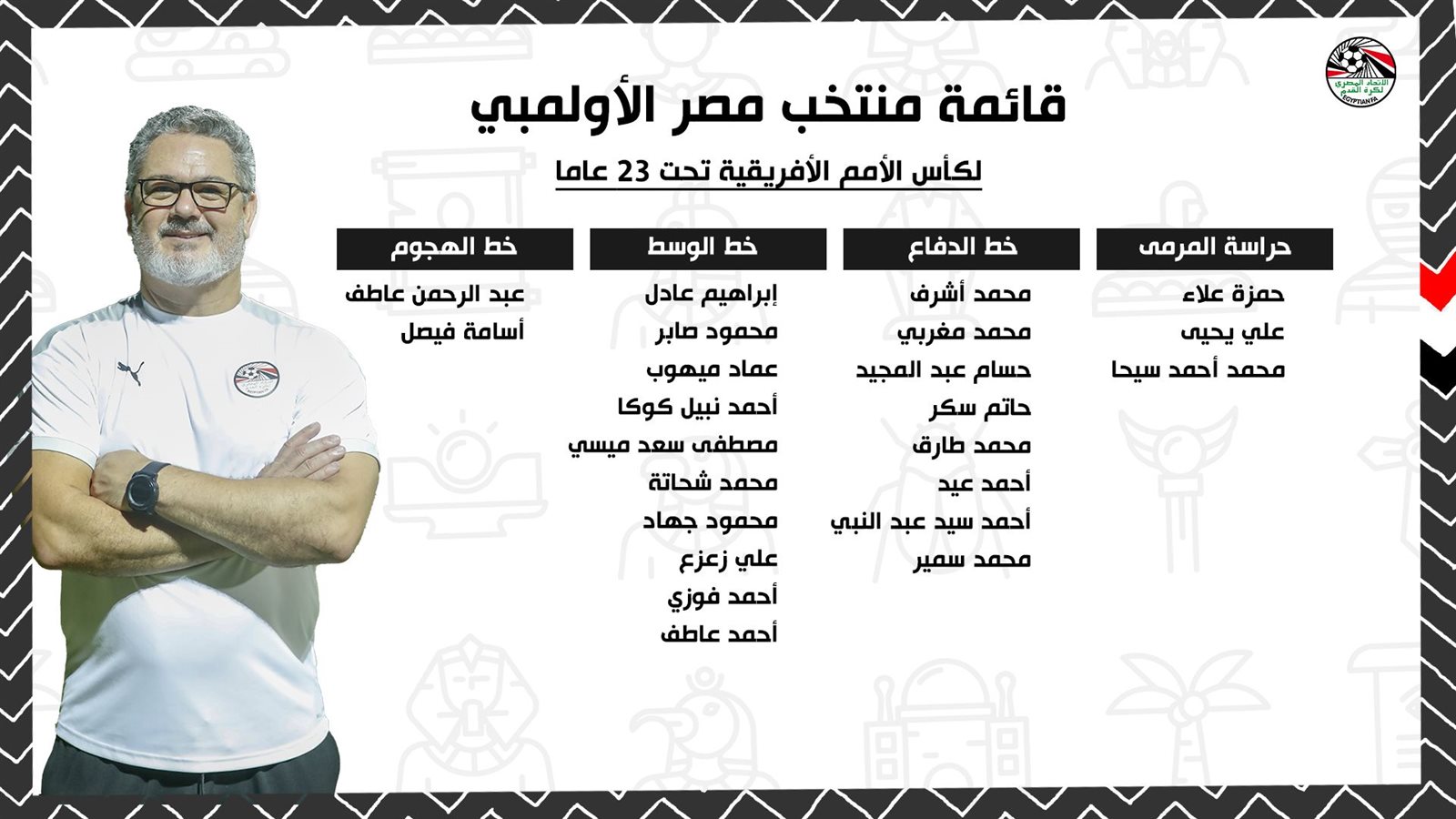 أعلن روجيريو ميكالي المدير الفني لمنتخب مصر الأولمبي، قائمة اللاعبين النهائية المشاركة في بطولة أمم إفريقيا المؤهلة لأولمبياد باريس 2024، والتي ضمت 23 لاعبًا.