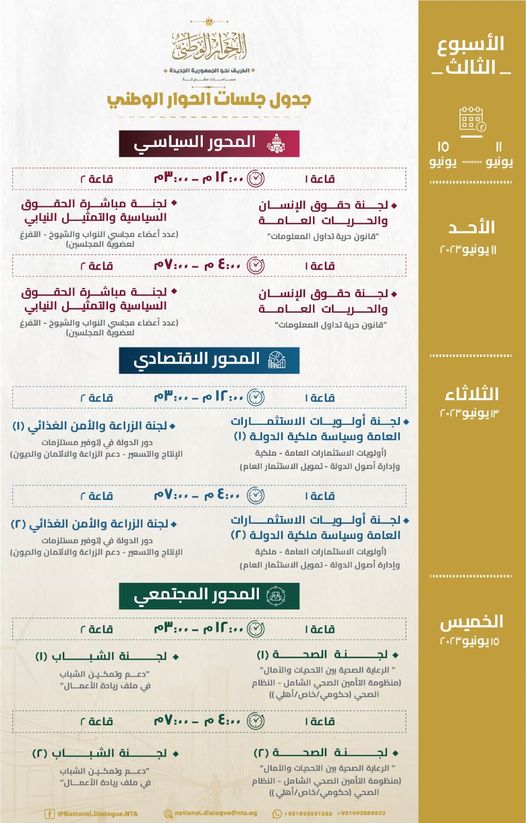 «عدد أعضاء البرلمان وتفرغهم و دعم مستلزمات الإنتاج وتمكين الشباب في ملف ريادة الأعمال»..ننشر جدول جلسات لجان الحوار الوطني بالأسبوع الثالث