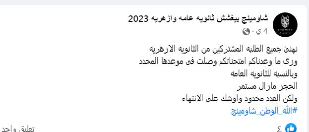 حيث دون شاومينج عبر صفحته على الفيس بوك منشورا يعلن فيه عن بدء حجز امتحانات الثانوية العامة 2023 للطلاب والدفع عن طريق الدفع كاش على الخاص.