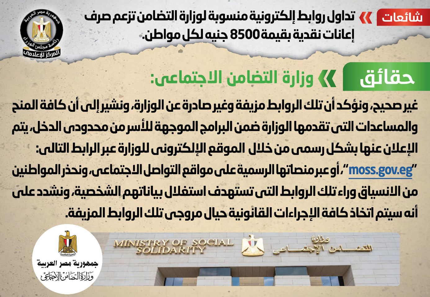 وقام المركز الإعلامي لمجلس الوزراء بالتواصل مع وزارة التضامن الاجتماعي، والتي نفت تلك الأنباء مُؤكدةً أنه لا صحة لصرف إعانات نقدية بقيمة 8500 جنيه لكل مواطن، وأن تلك الروابط مزيفة، وغير صادرة عن الوزارة.