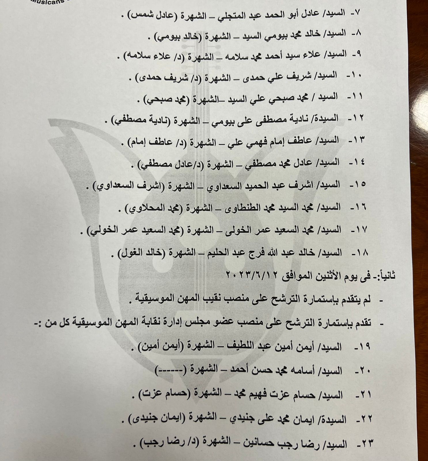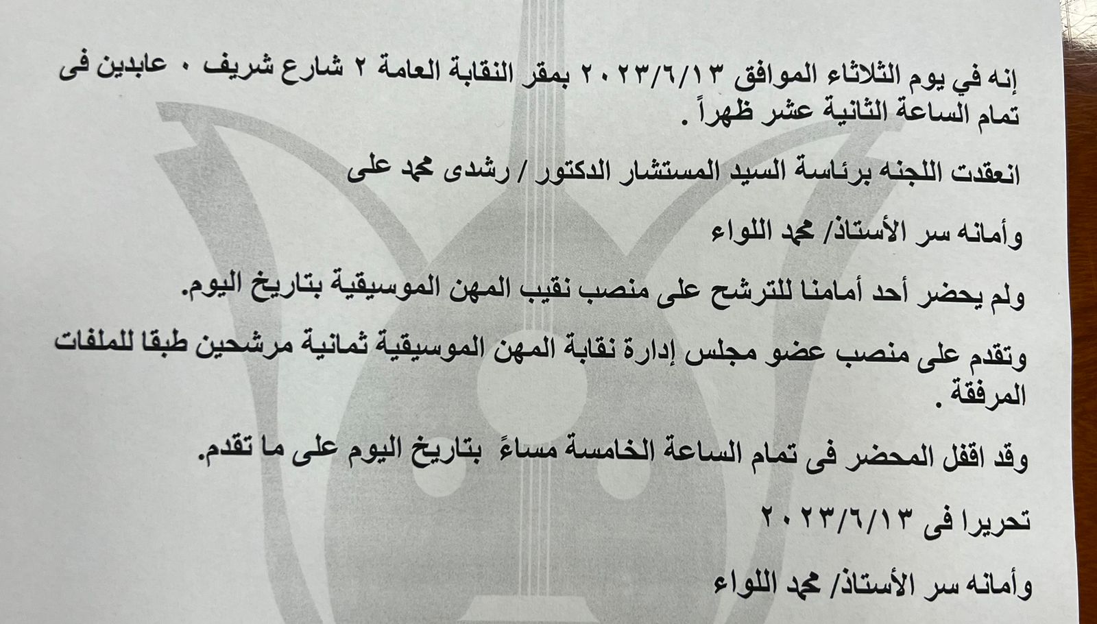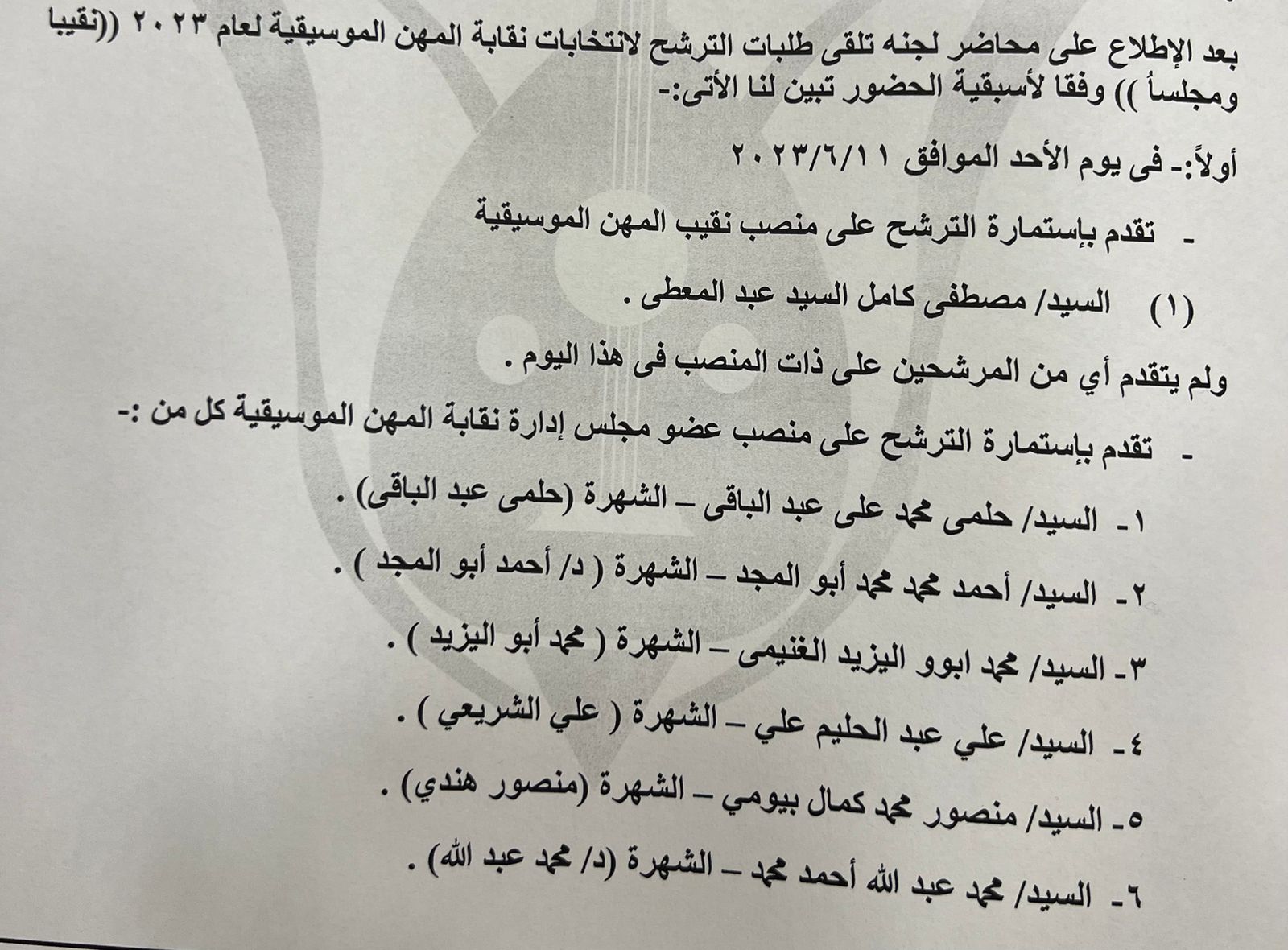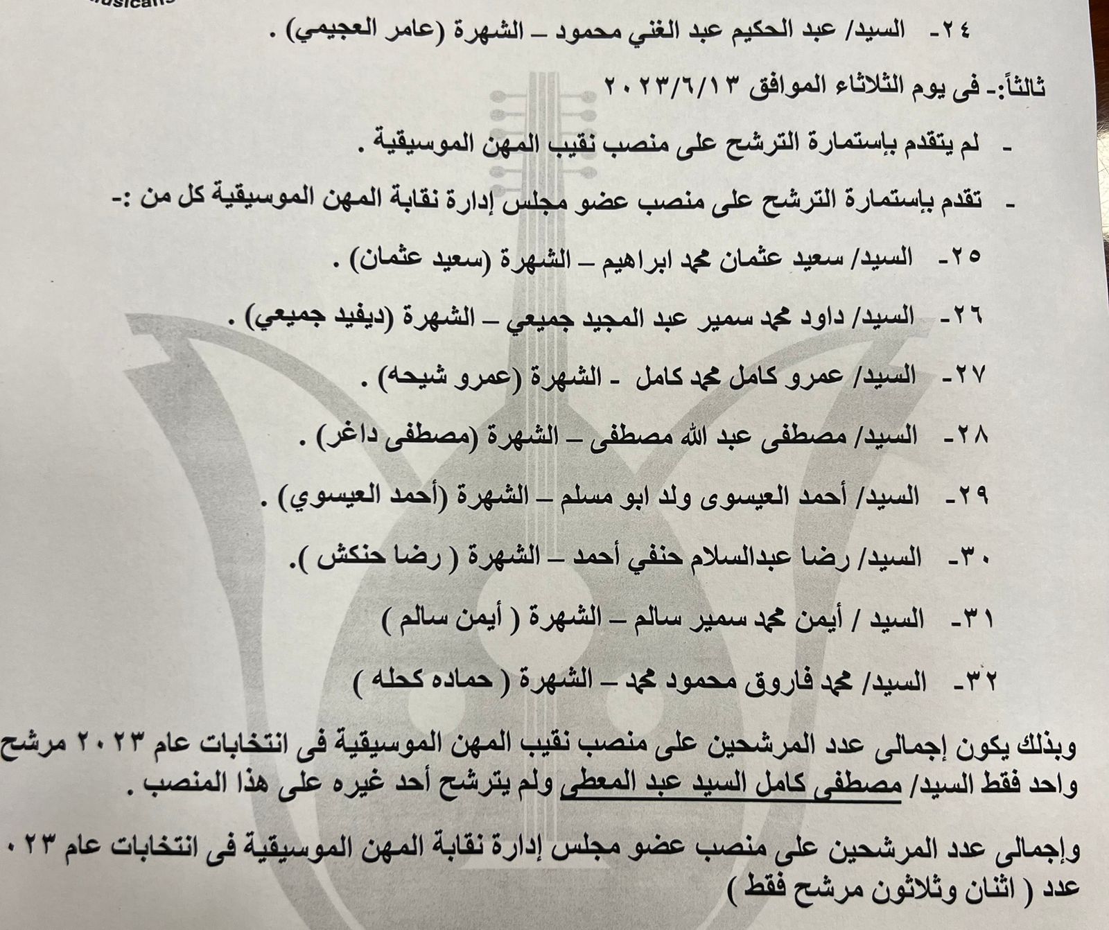 وكان قد تم غلق باب الترشح لانتخابات المهن الموسيقية اليوم الثلاثاء في الساعة الخامسة، ولم يترشح أحد أمام النقيب مصطفى كامل.