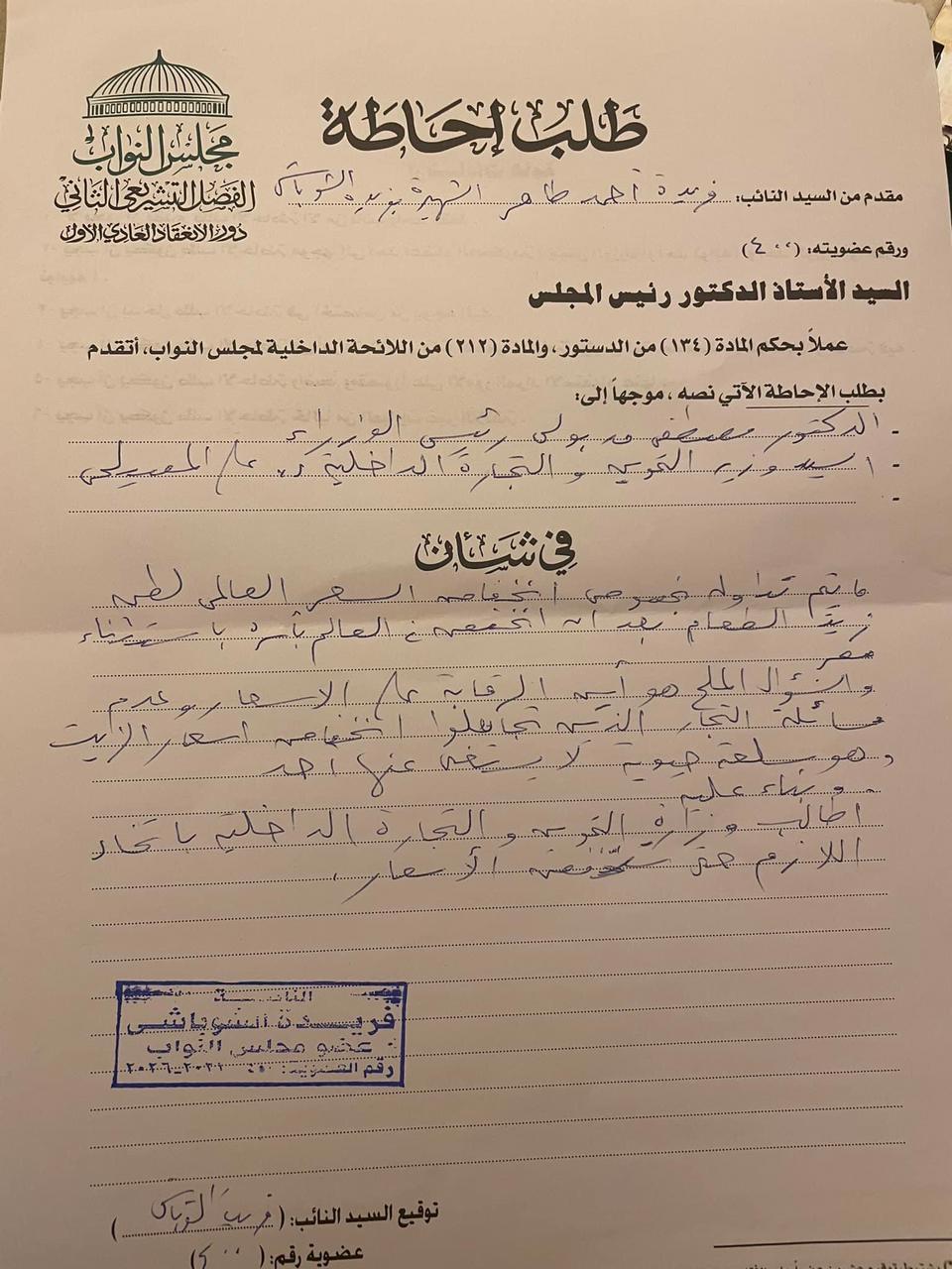 تقدمت النائبة فريدة الشوباشي، عضو مجلس النواب، بطلب إحاطة لرئيس مجلس النواب، حنفي جبالي، موجه للدكتور مصطفى مدبولي رئيس الوزراء، ووزير التموين والتجارة الداخلية، بشأن ما يتم تداوله بخصوص انخفاض السعر العالمي لطن زيت الطعام باستثناء مصر.