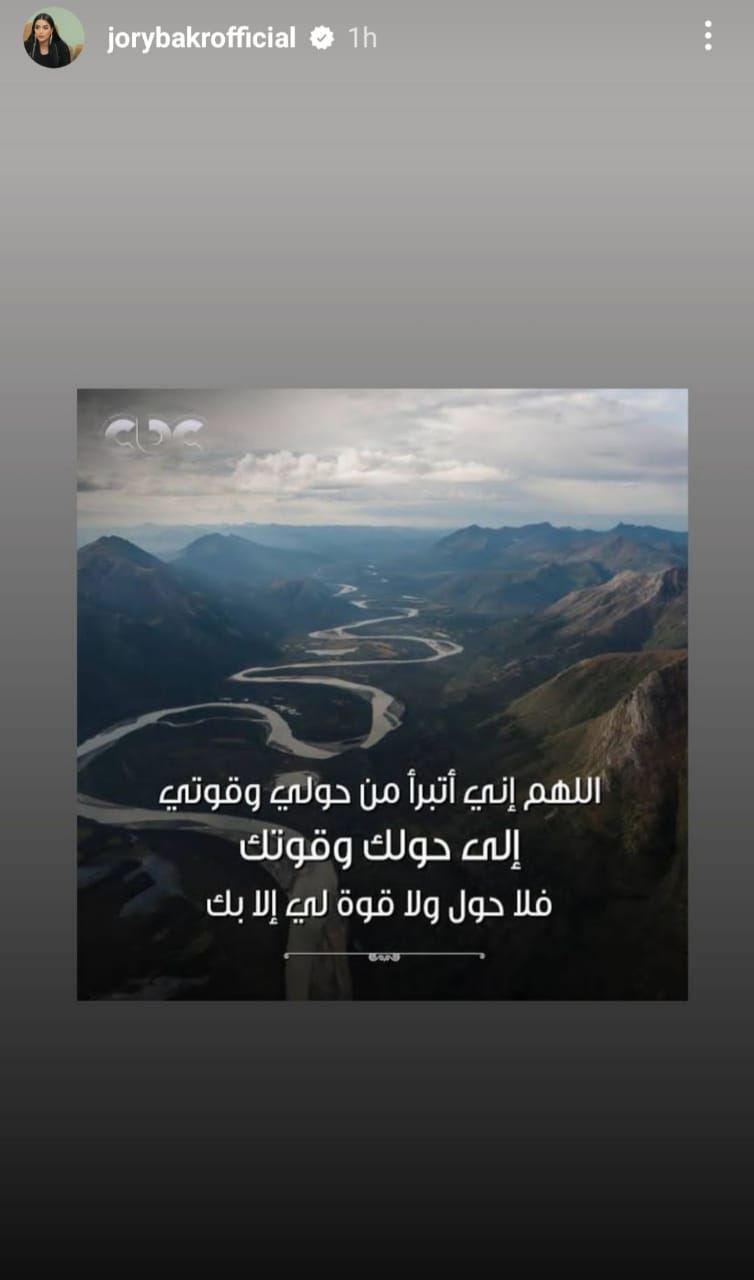 ونشرت جوري بكر من خلال خاصية استوري صورة مكتوب عليها: "اللهم أني أتبرأ من حولي وقوتي.. إلى حولك وقوتك.. فلا حول ولا قوة لي إلا بك"، ولم تعلق الفنانة على الصورة بأي كلمة.