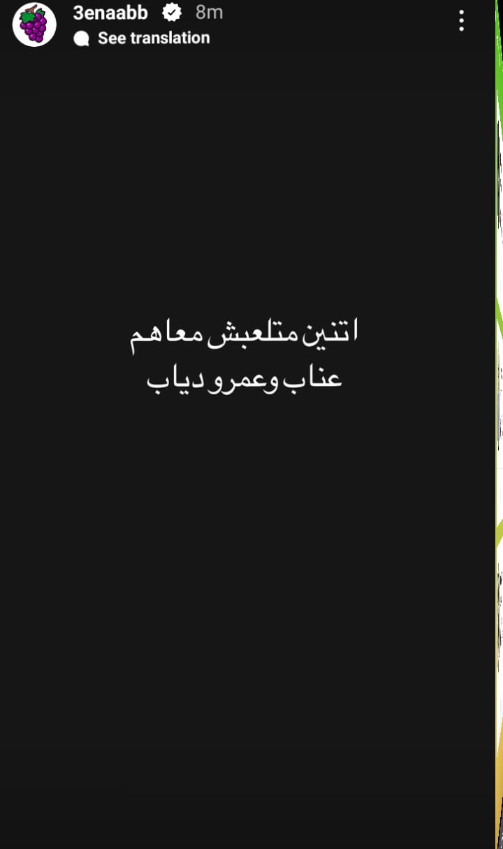 من جانبه أظهر عنبة بطريقته الخاصة أن كلام عمرو مصطفى بلا أهمية بالنسبة لهم، وكتب عبر حسابه الرسمي بموقع تبادل الصور والفيديوهات انستجرام، عبر خاصية “ستوري”: “اتنين متلعبش معاهم.. عناب وعمرو دياب”.