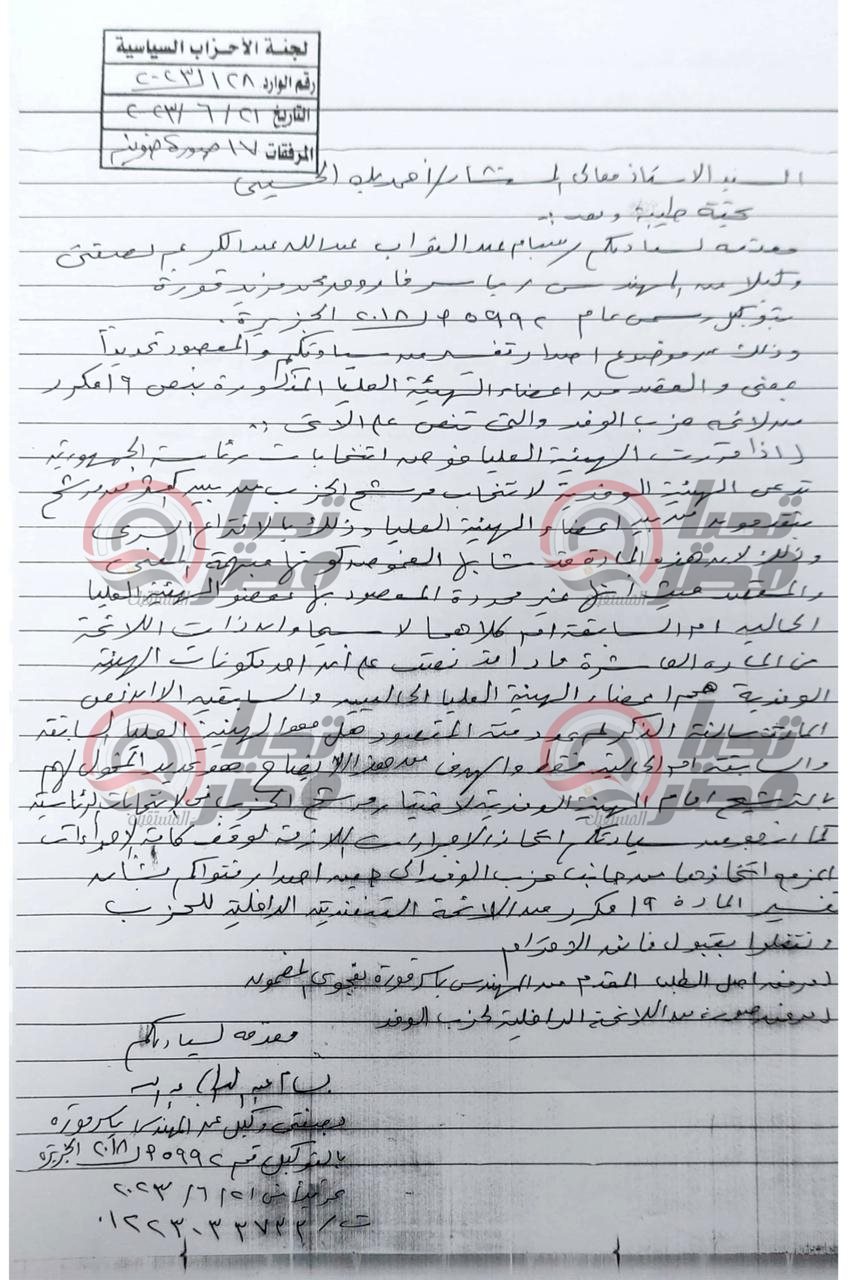 كما طالب باتخاذ الإجراءات اللازمة لوقف كافة الإجراءات الخاصة بتزكية ترشيح عبد السند يمامة، رئيس الحزب الحالي على قوائم الحزب.