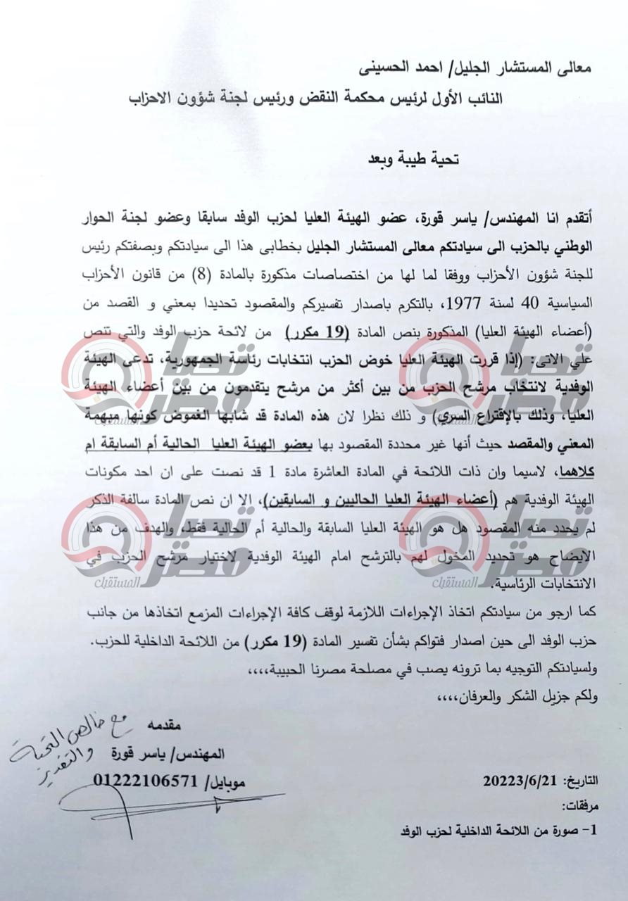 عضو الهيئة العليا لحزب الوفد السابق يخاطب لجنة شؤون الأحزاب ببطلان ترشيح «يمامة» لانتخابات الرئاسة