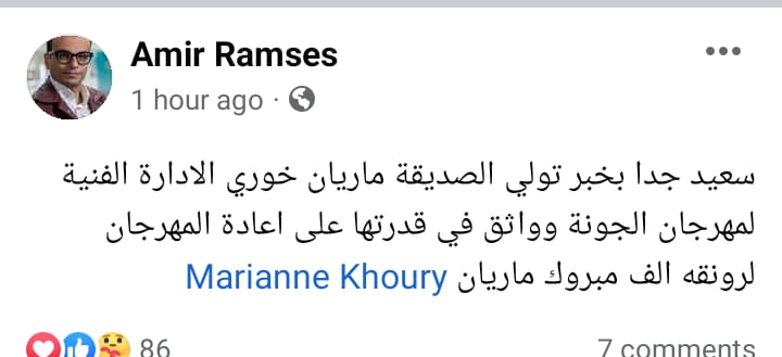 وكتب أمير رمسيس عبر حسابه الرسمي بموقع التواصل الإجتماعي فيسبوك، موجها حديثه لـ ماريان خوري: “سعيد جدا بخبر تولي الصديقة ماريان خوري الادارة الفنية لمهرجان الجونة وواثق في قدرتها على اعادة المهرجان لرونقه الف مبروك ماريان”.