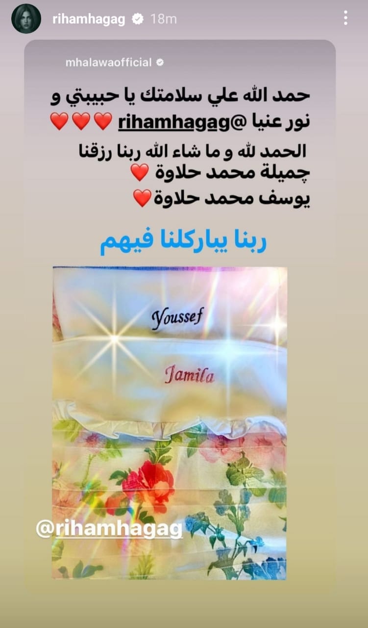 حيث كتب محمد حلاوة من خلال خاصية إستوري: حمد الله على سلامتك يا حبيبتي ونور عنيا، الحمد لله وما شاء الله ربنا رزقنا جميلة محمد حلاوة ويوسف محمد حلاوة، ربنا يباركلنا فيهم.