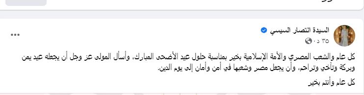 وكتبت “السيسي”، عبر صفحتها على فيس بوك: “كل عام والشعب المصري والأمة الإسلامية بخير بمناسبة حلول عيد الأضحى المبارك".