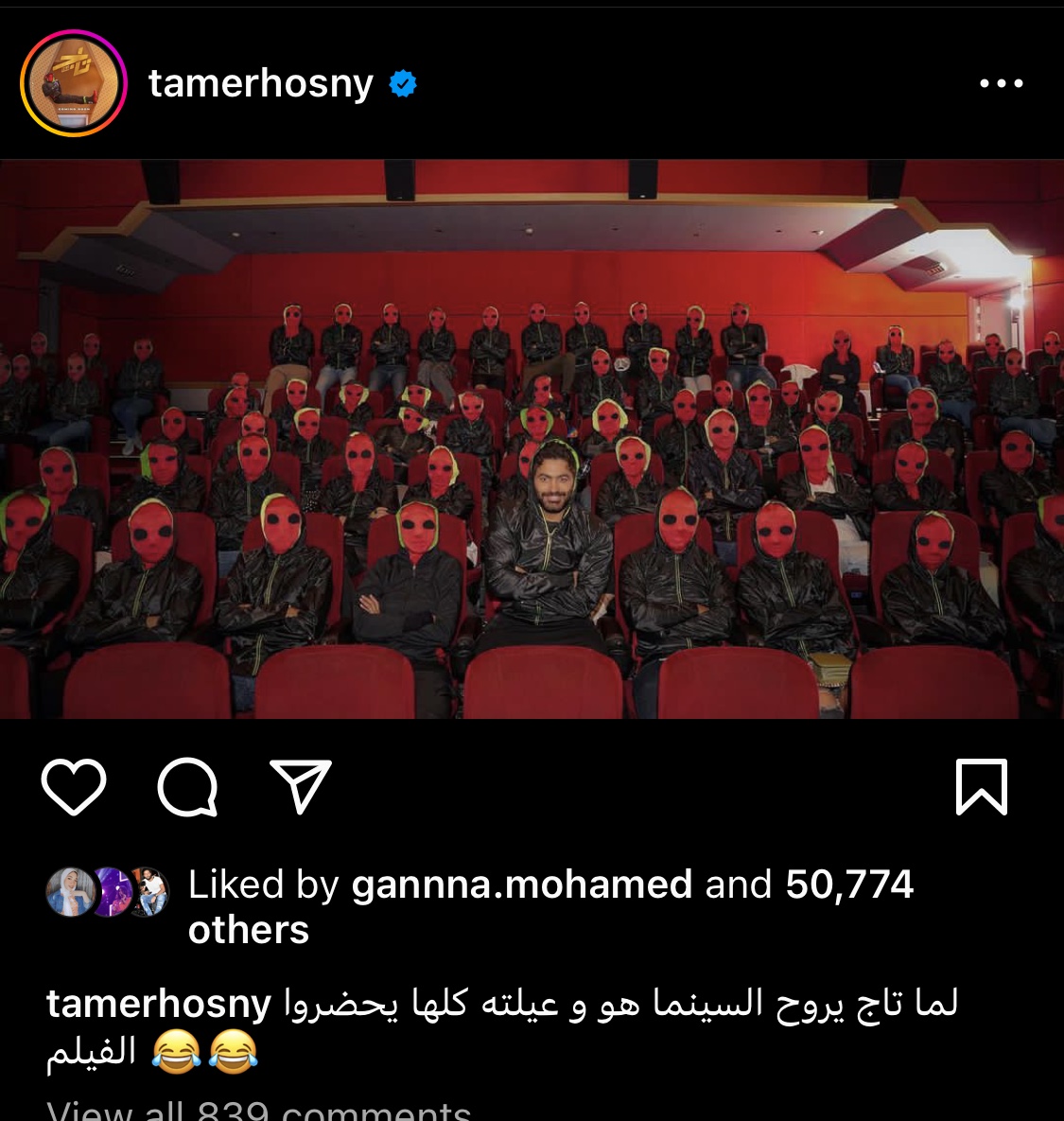ونشر تامر حسني صورة له وسط جمهوره من إحدى السينمات، وذلك عبر حسابه بموقع تبادل الصور والفيديوهات انستجرام وعلق عليها قائلًا: لما تاج يروح السينما هو و عيلته كلها يحضروا الفيلم.
