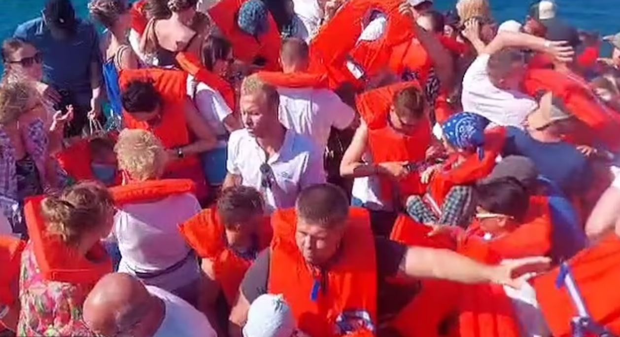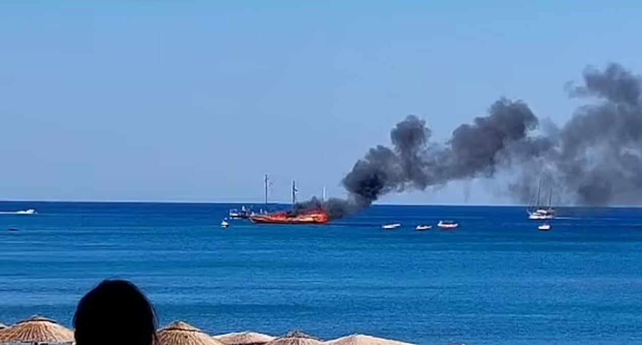 لحظة المأساوية تم فيها إنقاذ عشرات السياح من قارب محترق بعد أن إشتعلت فيه النيران يوم أمس الخميس قبالة جزيرة "رودس" اليونانية.