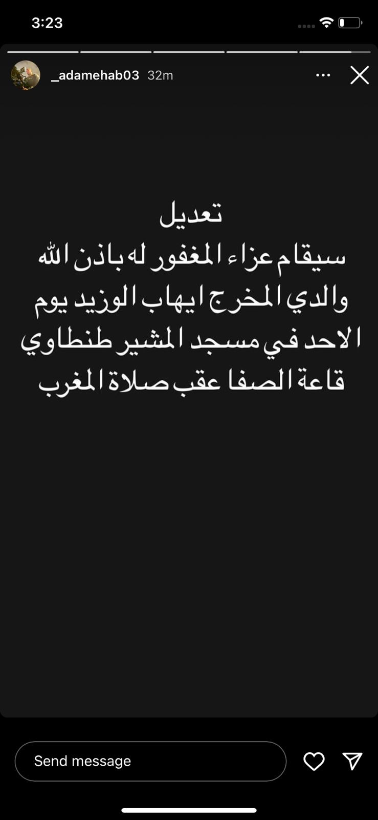وكتبت نجل إيهاب أبو زيد عبر موقع تبادل الصور والفيديوهات انستجرام، معلنا عن مكان العزا الجديد: سيقام عزا المغفور له بإذن الله والدي المخرج إيهاب أبو زيد في يوم الأحد بمسجد المشير طنطاوي قاعة الصفا عقب صلاة المغرب.