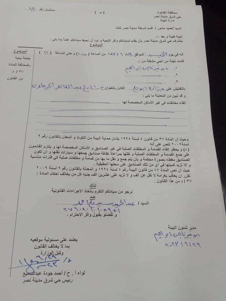 كما تم إرسال مذكرة من إدارة البيئة بحي شرق مدينة نصر بمحافظة القاهرة، إلى قسم مدينة نصر ثالث، لإتخاذ الإجراءات القانونية ضد الجزار المدعو عبد الحميد سيد علي صاحب محل جزارة أبو علي، بشأن قيامه بإلقاء مخلفات في غير الأماكن المخصصة لها، وهو ما يعد جنحة بيئية بالمخالفة للمادة 37 د من القانون، والتي تحظر إلقاء القمامة والمخلفات الصلبة في غير الصناديق والأماكن المخصصة لها وبلتزم القائمون على جمع القمامة والمخلفات الصلبة ونقلها بمراعاة نظافة صناديق جمعها، حيث نصت المادة 87 من قانون البيئة رقم 4 لسنة 1994 والمعدلة بالقانون رقم 9 لسنة 2009 أن يعاقب بغرامة لا تقل عن ألف جنيه ولا تزيد عن 20 ألف جنيه كل من يخالف أحكام المادة.