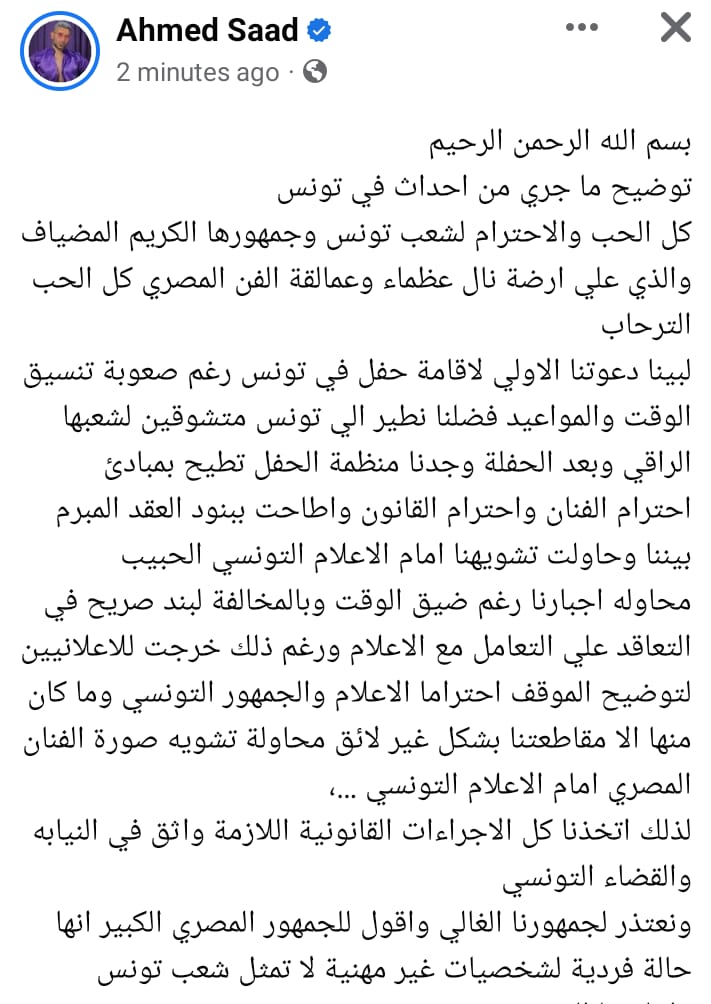 وكتبت أحمد سعد عبر حسابه الرسمي بموقع التواصل الإجتماعي “فيسبوك”: بسم الله الرحمن الرحيم توضيح ما جري من احداث في تونس كل الحب والاحترام لشعب تونس وجمهورها الكريم المضياف والذي علي ارضة نال عظماء وعمالقة الفن المصري كل الحب الترحاب لبينا دعوتنا الاولي لاقامة حفل في تونس رغم صعوبة تنسيق الوقت والمواعيد فضلنا نطير الي تونس متشوقين لشعبها الراقي.