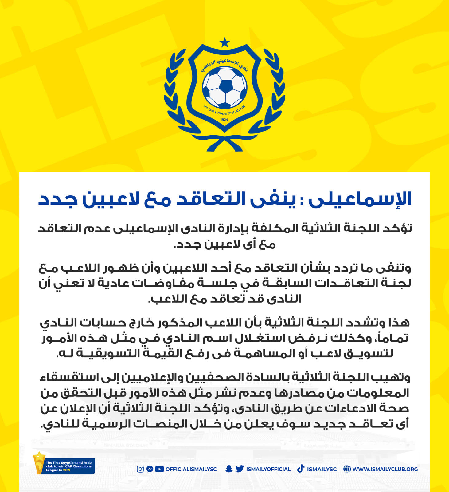 تؤكد اللجنة الثلاثية المكلفة بإدارة النادي الإسماعيلي، عدم التعاقد مع أي لاعبين جُدد، وتنفي ما تردد بشأن التعاقد مع أحد اللاعبين وأن ظهور اللاعب مع لجنة التعاقدات السابقة، في جلسة مفاوضات عادية لا تعني أن النادي قد تعاقد مع اللاعب".