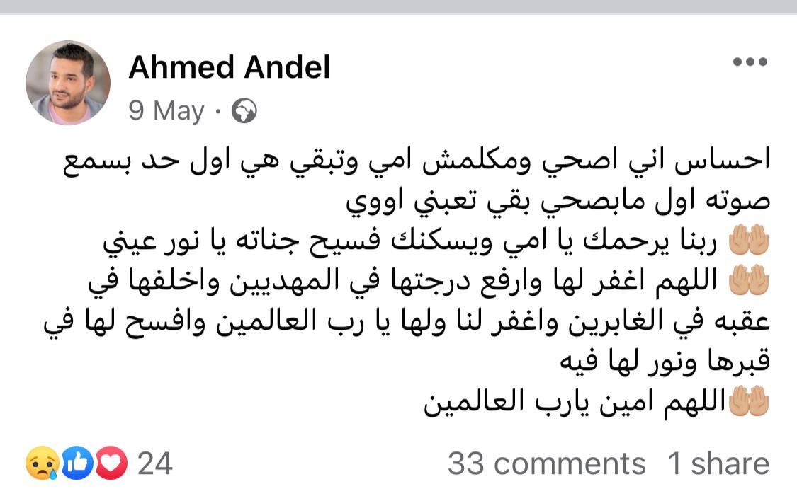 وتابع: خنقة وعصبية وعدم وعي وتفكير كتيربدون سبب اكتر فترة في حياتي كل حاجة فيها ملخبطة كل حاجة حرفيًا.. ربنا يرحمك يا حبيبتي ويسكنك فسيح جناته ويصبرني علي فراقك ويجمعني بيكي عن قريب انشاء الله.. اسألكم الدعاء لنور عيني امي.