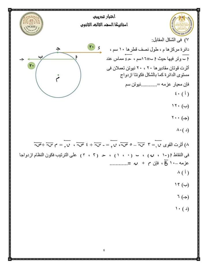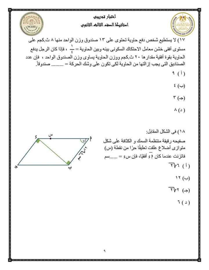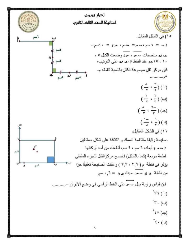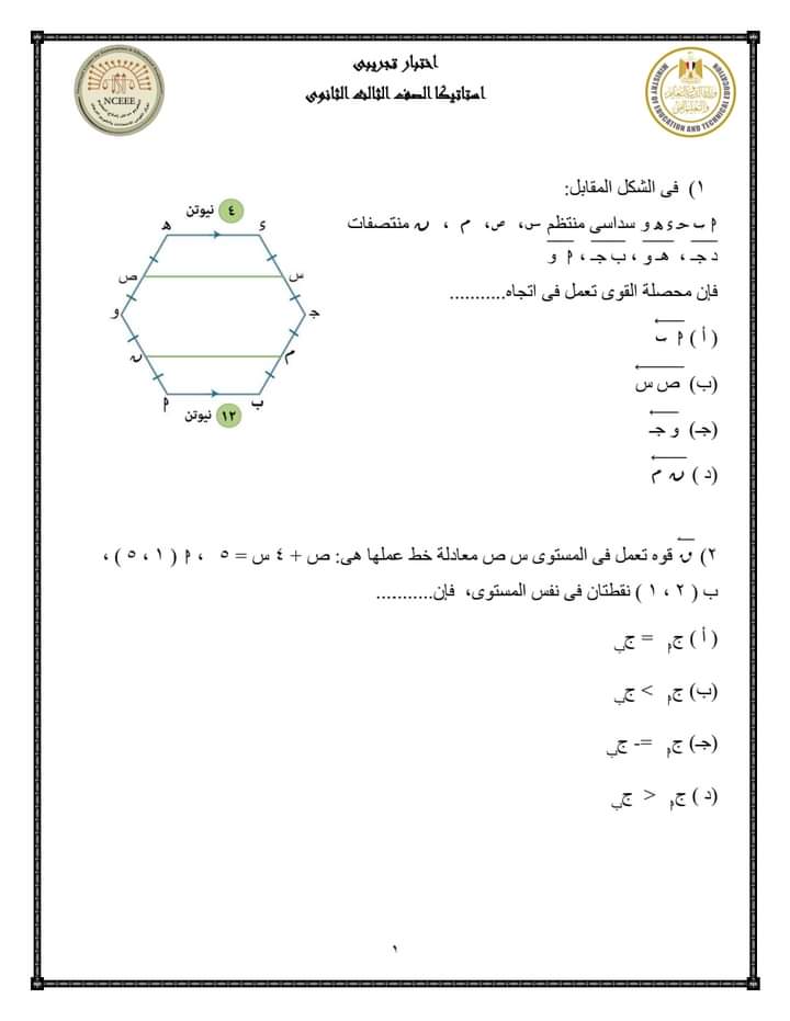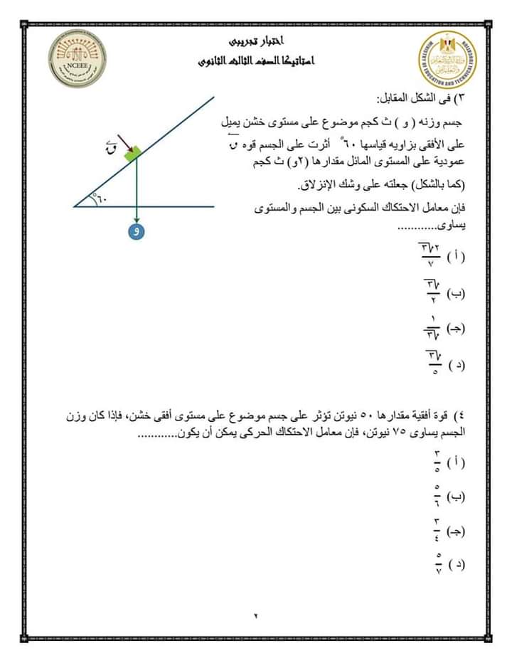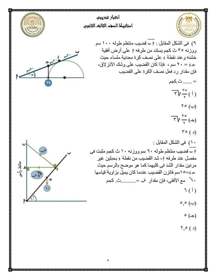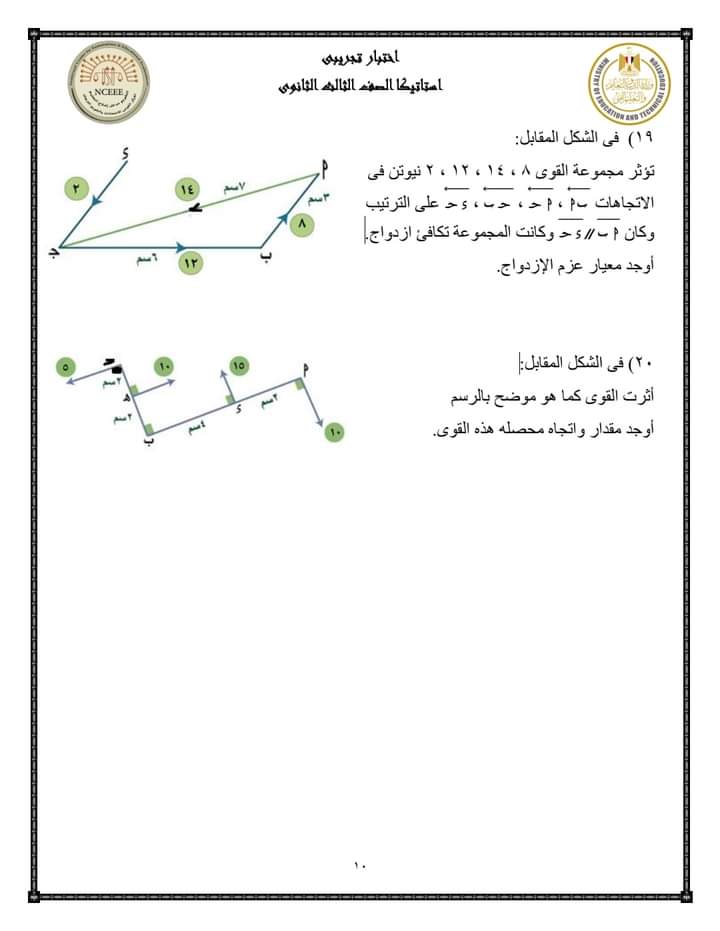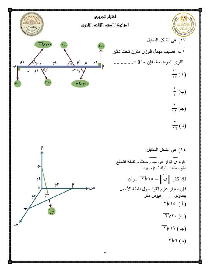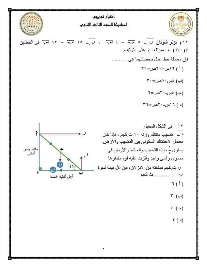 وجاء نموذج امتحان الاستاتيكا للثانوية العامة علمى رياضة كما أعلنت عنه وزارة التربية والتعليم والتعليم الفنى عبر موقعها الرسمي كالتالي: