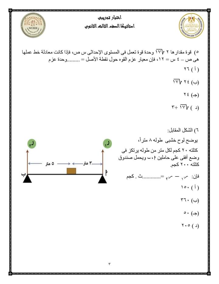 ننشر نموذج امتحان الاستاتيكا للثانوية العامة علمى رياضة