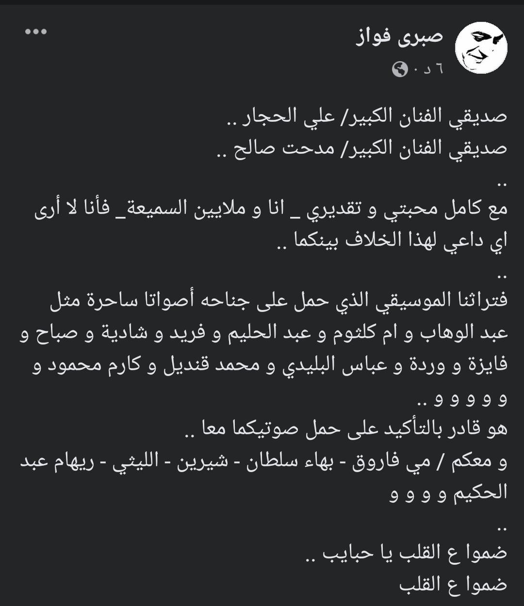 وكتب صبري فواز: صديقي الفنان الكبير علي الحجار.. صديقي الفنان الكبير مدحت صالح.. مع كامل محبتي وتقديري.. أنا وملايين السميعة.. فأنا لا أرى أي داعي لهذا الخلاف بينكما.. فتراثنا الموسيقي الذي حمل على جناحه أصواتا ساحرة مثل عبد الوهاب وأم كلثوم وعبد الحليم وفريد وشادية وصباح وفايزة ووردة وعباس البليدي ومحمد قنديل وكارم محمود و و و و و و.. هو قادر بالتأكيد على حمل صوتيكما معا.. ومعكم مي فاروق - بهاء سلطان - شيرين - الليثي - ريهام عبد الحكيم و و و و.. ضموا ع القلب يا حبايب.. ضموا ع القلب.