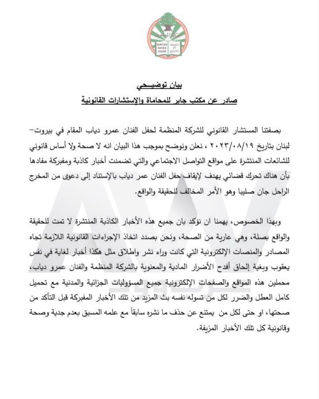 وعلى صعيد أخر، خرجت الشركة المنظمة لحفل عمرو دياب المقرر إقامته الشهر المقبل لترد على كل الأقاويل والأخبار المنتشرة بشأن إلغائه، وأكدت على أن كل ذلك ليس له أي أساس من الصحة، مشيرة إلى أنها ستتخذ كافة الإجراءات القانونية ضد مروجي تلك الشائعات.