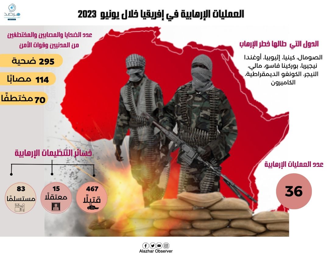 شهد شهر يونيو 2023م ارتفاعًا ملحوظًا في نسبة العمليات الإرهابية التي تشنها التنظيمات المتطرفة في إفريقيا مقارنة بشهر مايو الماضي بمعدل 20%؛ حيث سجل هذا الشهر (36) عملية إرهابية تنوعت ما بين تفجيرات واغتيالات، وقد أدى هذا الارتفاع بطبيعة الحال إلى ارتفاع أعداد الضحايا والمصابين والمختطفين خلال هذا الشهر؛ حيث أسفرت العمليات عن سقوط (295) ضحية، و(114) مصابًا، و(70) رهينة. بينما بلغ عدد العمليات في شهر مايو المنصرم (30) عملية إرهابية، خلّفت (268) ضحية، وإصابة (33)، واختطاف (33) آخرين.