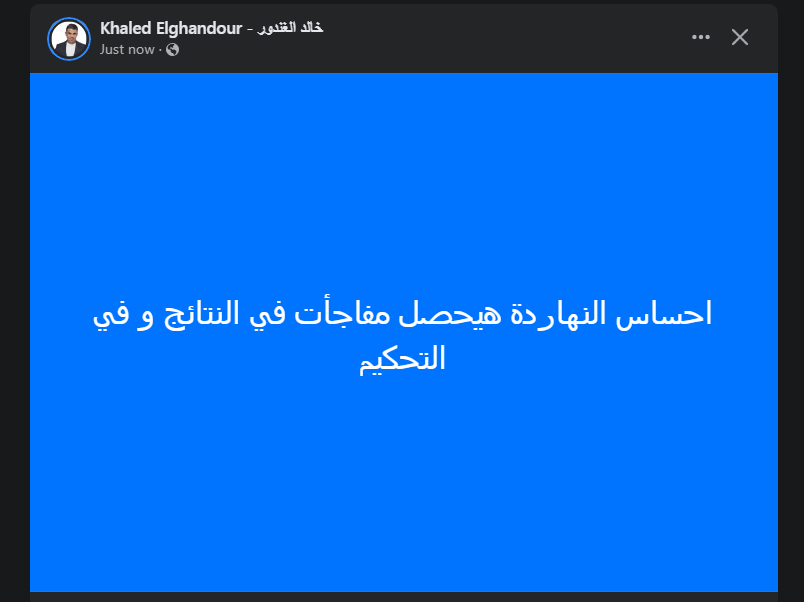 وكتب خالد الغندور عبر حسابه الرسمي"فيسبوك":" احساس النهاردة هيحصل مفاجأت في النتائج وفي التحكيم".