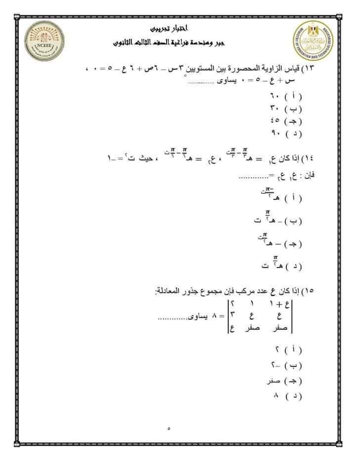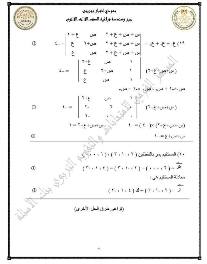نموذج امتحان الجبر والهندسة الفراغية للثانوية العامة 2023