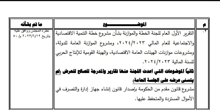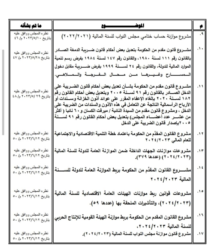 على مدار دور الانعقاد الثالث للمجلس (أكتوبر 2022- يوليو 2023). مجلس النواب يواصل أداء مهامه البرلمانية على جميع المستويات: التشريعية، والسياسية، والاقتصادية، والاجتماعية، والمالية، والرقابية؛ ليؤدي دوره المنوط به في خدمة الوطن، طبقًا للدستور وأحكام لائحته الداخلية.